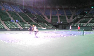 昨日に続いて、有明でテニス!しかし、今日は、コロシアムのセンターコートを借りた。午前の部(15名くらい)&午後の部(20名くらい)で、熱戦が繰り広げられた。このコートは、過去、フェデラー、シャラポア、ロディック、ヒューイットなど、トッププレーヤーが戦った、記念すべきコートである! 今回、残念ながら、非公開(笑)で、観客はなかった・・・。